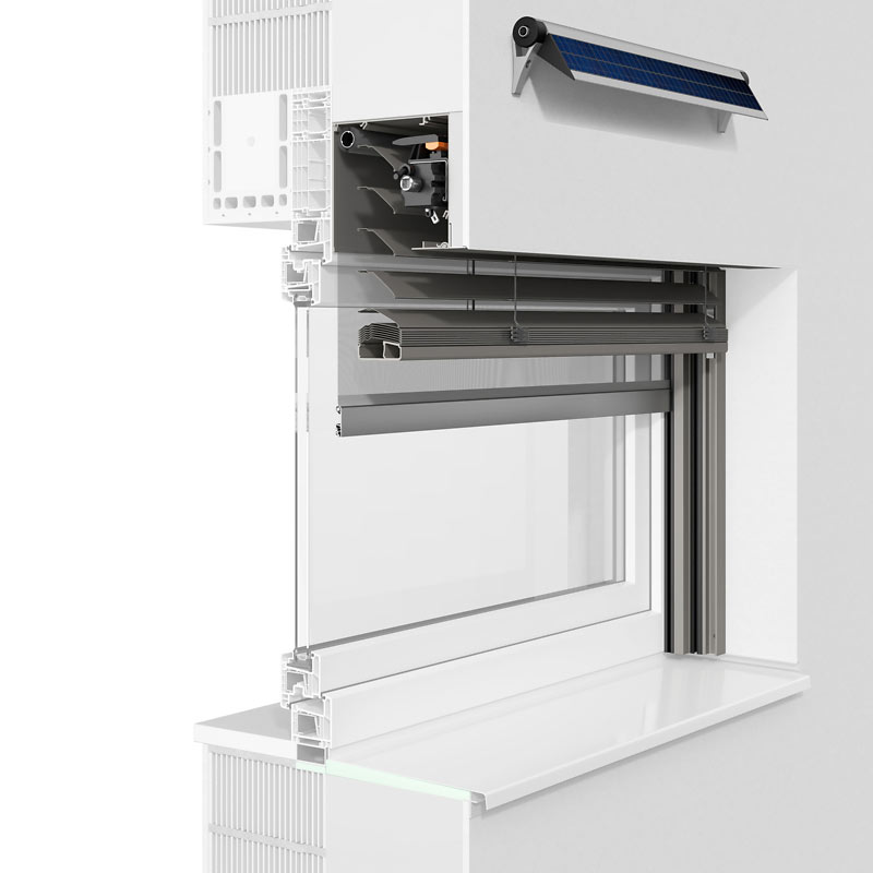 Durch die auf Plattformtechnologie basierenden Rollladensystemen der .XP-Baureihe, erhält der Bauherr moderne Bauelemente, die durch Zusatzausstattungen multifunktional ausrüstbar sind und dadurch einen deutlichen Mehrwert bieten. Die auch nachträglich einsetzbaren Module mit Insektenschutzgitter oder textilem Sonnenschutz erweitern den Rollladen sinnvoll. Es sind keine von außen montierten Extra-Einrichtungen nötig. Alles ist sauber im Kasten untergebracht und wird in einer zweiten Laufkammer hinter dem Rollladenprofil geführt.